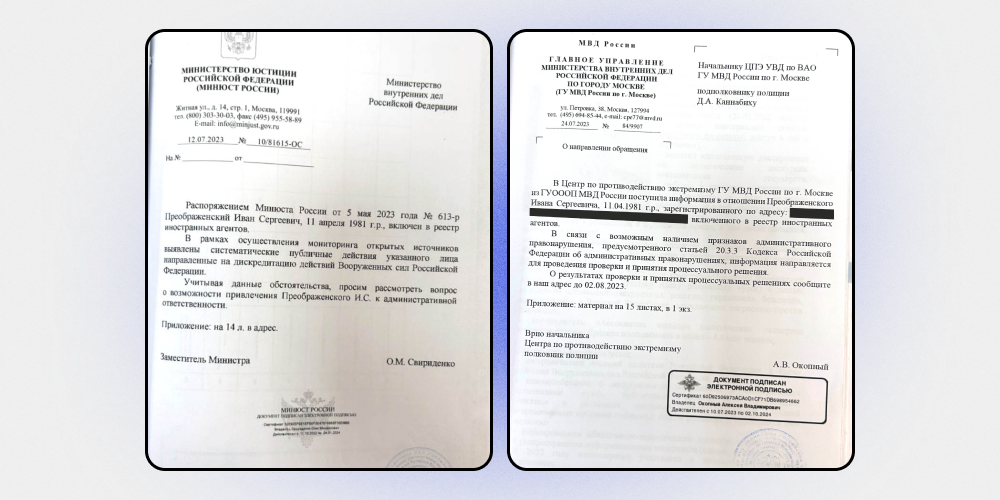 Позже выяснилось, что в материалах дела есть письмо заместителя министра юстиции РФ Олега Свириденко, которое было отправлено в МВД РФ. В нем он объясняет, что проводил мониторинг деятельности «иноагентов», нашел в постах Преображенского информацию, которую можно квалифицировать как «дискредитацию» и отправил скриншоты в полицию, поскольку сам составить такой протокол не мог — у него нет полномочий. Делом занимался сотрудник Центра «Э» Алексей Окопный, который построил карьеру на преследовании оппозиционеров. Ранее его обвиняли в убийстве нацбола Юрия Червочкина и в угрозах физической расправы во время задержаний.