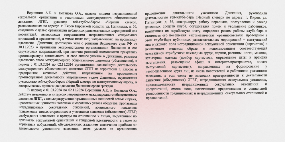 Первые проблемы с такими заведениями в Кирове начались с нас. 13 января 2024 года (согласно решению суда, старший лейтенант полиции Ерошкин А.В. составил протокол 19 января, — Прим. «Первого отдела») к нам пришли сотрудники УМВД и написали на нас заявление за то, что мы занимаемся «ЛГБТ-пропагандой». В марте Октябрьский районный суд признал нас виновными и назначил штраф в 500 000 рублей. В решении суда в качестве доказательства «пропаганды ЛГБТ» было указано несколько моментов: на стенах бара были нарисованы люди с кошачьими головами, на одном из них была портупея, один из выступающих артистов заявлял о себе в СМИ как об открытом гее, во время составления протокола на камеру сотрудников попал поцелуй двух мужчин — гости были пьяными, мы общались с полицией, поэтому они были предоставлены сами себе. Позже этих мужчин оштрафовали. Одного на 50 000 рублей, второго на 25 000.