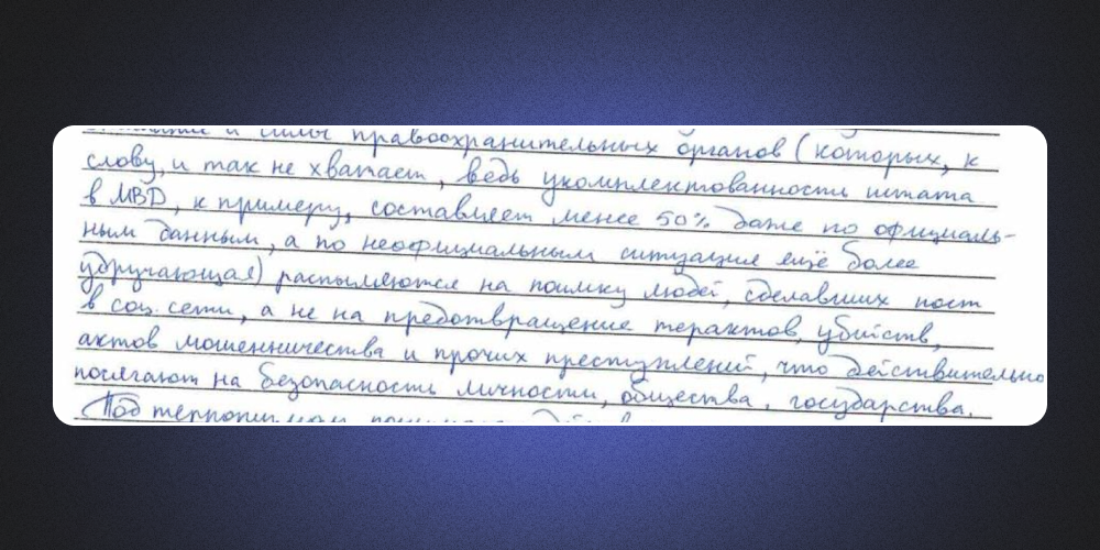 Внимание и силы правоохранительных органов (которых, к слову, и так не хватает, ведь укомплектованность штата МВД, к примеру, составляет менее 50% даже по официальным данным, а по неофициальным, ситуация еще более удручающая) распыляются на поимку людей, сделавших пост в соцсети, а не на предотвращение терактов, убийств, актов мошенничества и прочих преступлений, что действительно посягают на безопасность личности, общества, государства.